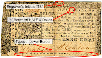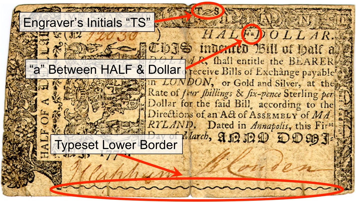In Maryland, William Green of Annapolis used other anti-counterfeiting measures included using random wavy (indented) borders that had to match the original stub book, elaborate engravings, random punctuation, and superfluous characters. The example to the right is a “Half of a Dollar” from the Maryland emission of March 1, 1770. On this example, the engraver’s initials “TS” (Thomas Sparrow) appear at to the top, a small “a” was inserted between “half” and “dollar” while there is an accent mark over the “a” in “Exchange.”