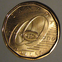 The first is a 2009 Canadian one-dollar coin. Instead of a Loony—the reverse with an image of a common loon—the reverse features a commemorative to the one hundred anniversary of the Montreal Canadiens hockey team. The standard Loonie is an eleven-sided smooth edged coin that is 26.5mm in diameter and made from bronze plated nickel. The 2009 Loonies with the Canadiens Centennial reverse was only circulated in Quebec making it a unique collectible.