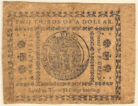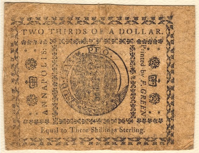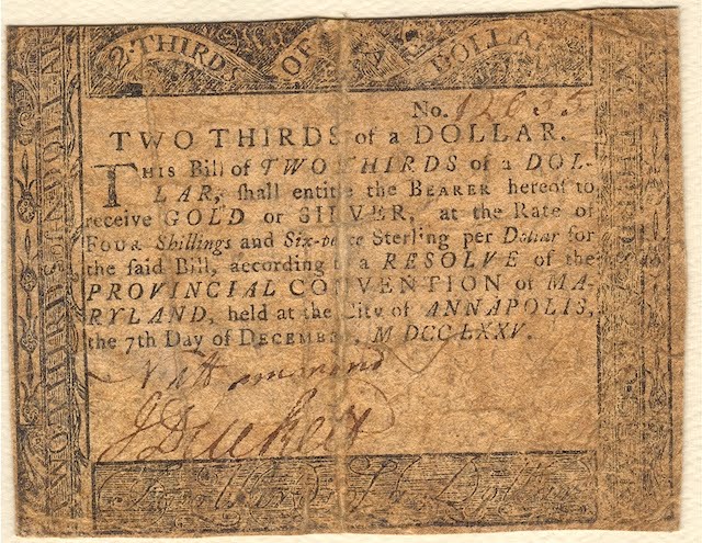 Those who study the history of colonial currency are quick to note that Maryland notes declare that they “shall entitle the Bearer hereof to receive BILLS of Exchange payable in LONDON, or Gold and Silver, at the rate of FOUR SHILLINGS AND SIX PENCE sterline per Dollar for the said BILL.” Notes issued by the Maryland Colonial Council were backed by the profits of Calvert family whose head was Frederick Calvert, the Sixth Lord of Baltimore.
