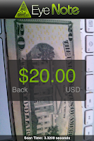 According to the press release received this morning, EyeNote uses image recognition technology to determine a note’s denomination. The mobile device’s camera requires 51 percent of a note’s scanned image, front or back, to process. In a matter of seconds, EyeNote can provide an audible or vibrating response, and can denominate all Federal Reserve notes issued since 1996. The app will be updated as new notes are issued.