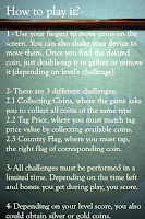 The game has three sub-games called levels: Collecting Coins where you double-tap on the coins of the type asked for before the level begins; Tag Price where you collect coins from the pile that add up to the amount shown on the price tag; and Country Flag where you match the coin to the flag of the country it is from. All three “levels” are fun. I like the concepts in the game but there are problems. First, more than once in the Tag Price level I could not reach the tag price because the coins were not available. One time I was not provided a Canadian 5-cent piece or enough Canadian 1-cent coins in order to make the required amount. In several other cases, I was not given enough 1-cent or 1-pence coins to make the price.
