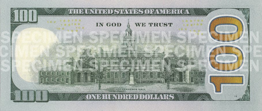 The back of the note has a new vignette of Independence Hall featuring the rear, rather than the front, of the building. Both the vignette on the back of the note and the portrait on the front have been enlarged, and the oval that previously appeared around both images has been removed. Also on the right of the reverse is a large “100” printed in gold ink. It is expected that this feature will help those with visual impairments distinguish the denomination.
