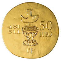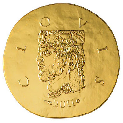 The reverse of the Clovis coin has a dove flying over a baptismal font representing his Catholic heritage.