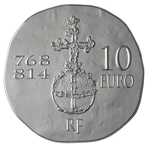 The reverse of the Charlemagne coin features a cross-bearing orb (globus cruciger in Latin), Charlemagne’s symbol of his sovereignty and power as the first emperor of the Holy Roman Empire.