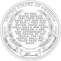 The reverse was designed and sculpted by Sculptor-Engraver Phebe Hemphill. The design features the an inscription of the last 43 words of the Gettysburg Address: