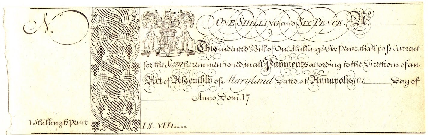Those who study the history of colonial currency are quick to note that Maryland notes declare that they “shall entitle the Bearer hereof to receive BILLS of Exchange payable in LONDON, or Gold and Silver, at the rate of FOUR SHILLINGS AND SIX PENCE sterline per Dollar for the said BILL.” Notes issued by the Maryland Colonial Council were backed by the profits of Calvert family whose head was Frederick Calvert, the Sixth Lord of Baltimore.