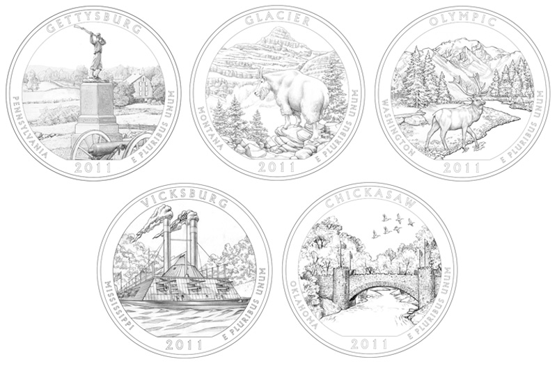 In the second year of the American the Beautiful Quarters Program. If the second year designs are as well executed as the first year, the program will continue to be a success from a collector perspective. The second group of quarters will honor Gettysburg National Military Park in Pennsylvania, Glacier National Park in Montana, Olympic National Park in Washington, Vicksburg National Military Park in Mississippi, and Chickasaw National Recreation Area in Oklahoma. The U.S. Mint’s line art shows promise for a very nice looking series.