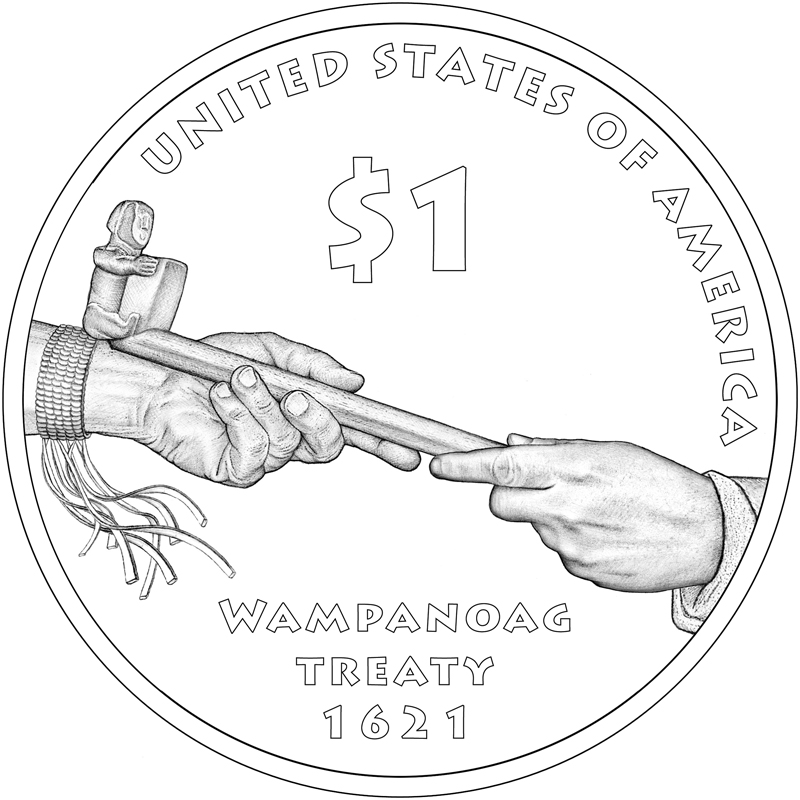 For the third year of the Native American $1 Coin program, the theme for 2011 is “Supreme Sachem Ousamequin, Massasoit of the Great Wampanoag Nation Creates Alliance with Settlers at Plymouth Bay (1621)” celebrating one of the first peace treaties between the Native Americans and the Puritans who settled at Plymouth Bay. The reverse of the coin depicts the hands of the Supreme Sachem Ousamequin Massasoit and Governor John Carver symbolically offering the ceremonial peace pipe after the initiation of the first formal written peace treaty. The designs of the Native American coins have been so well thought out and executed that this one will be a wonderful addition to your collection.